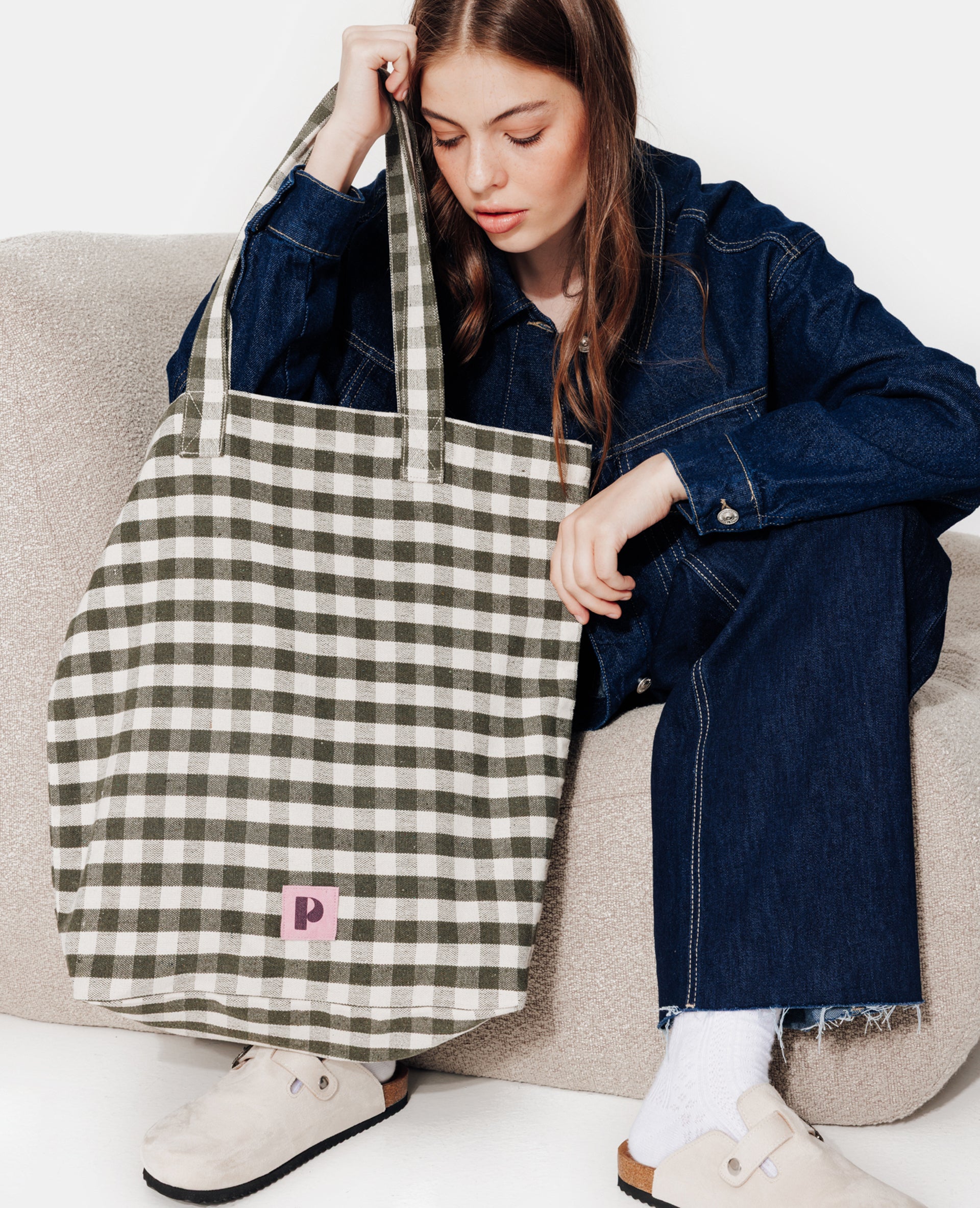 - Tote bag motif vichy kaki et blanc.
