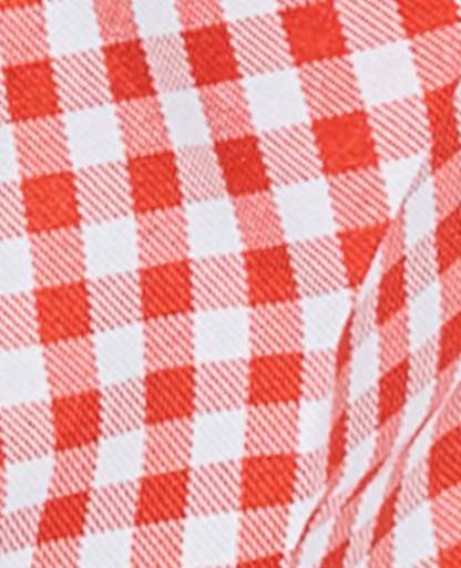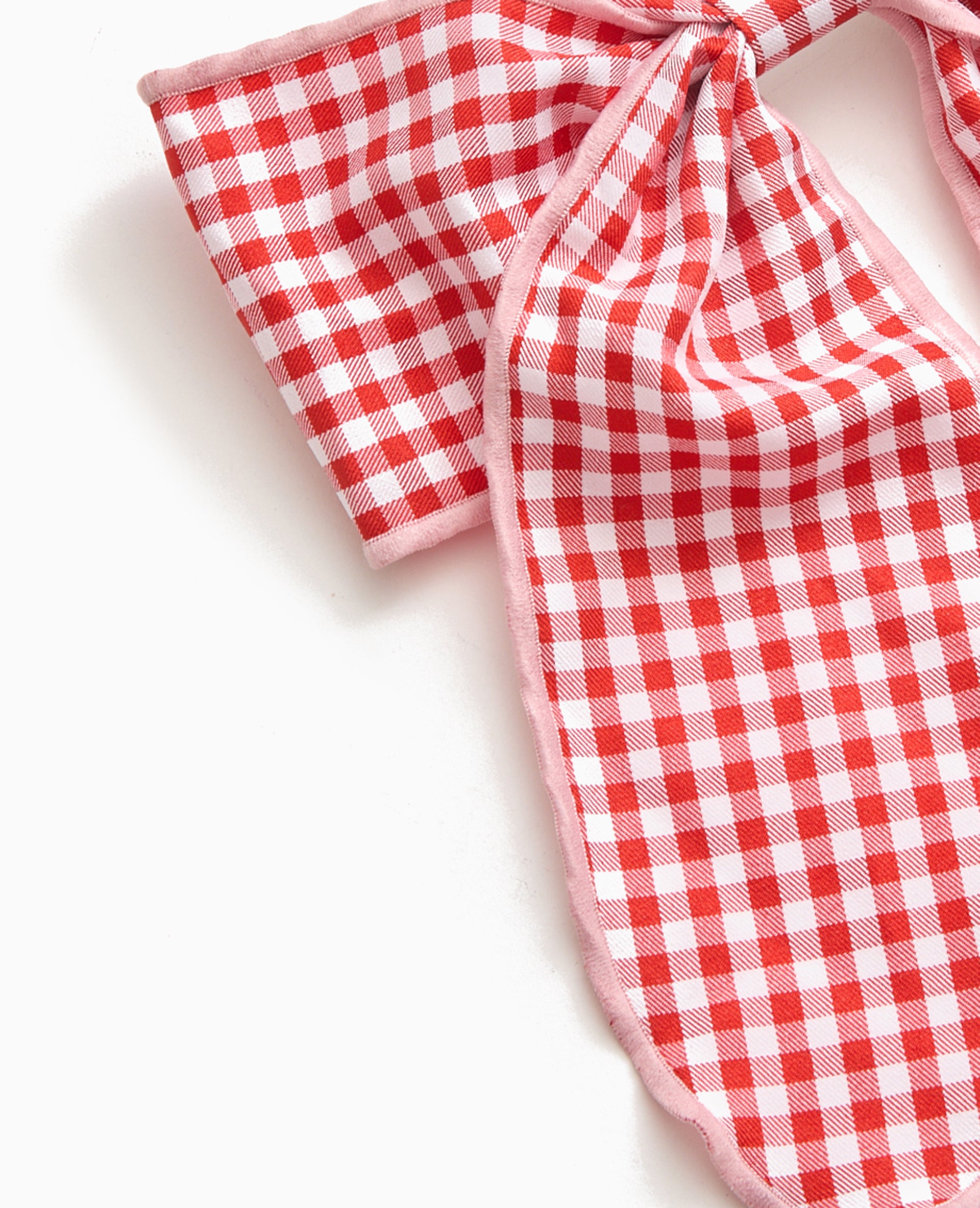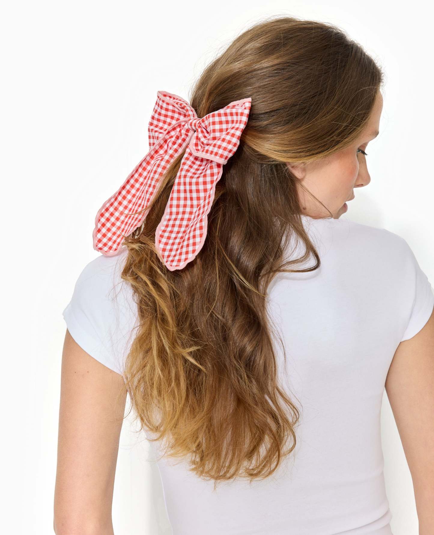 - Barrette avec grand nœud en tissu motif vichy rouge et blanc.