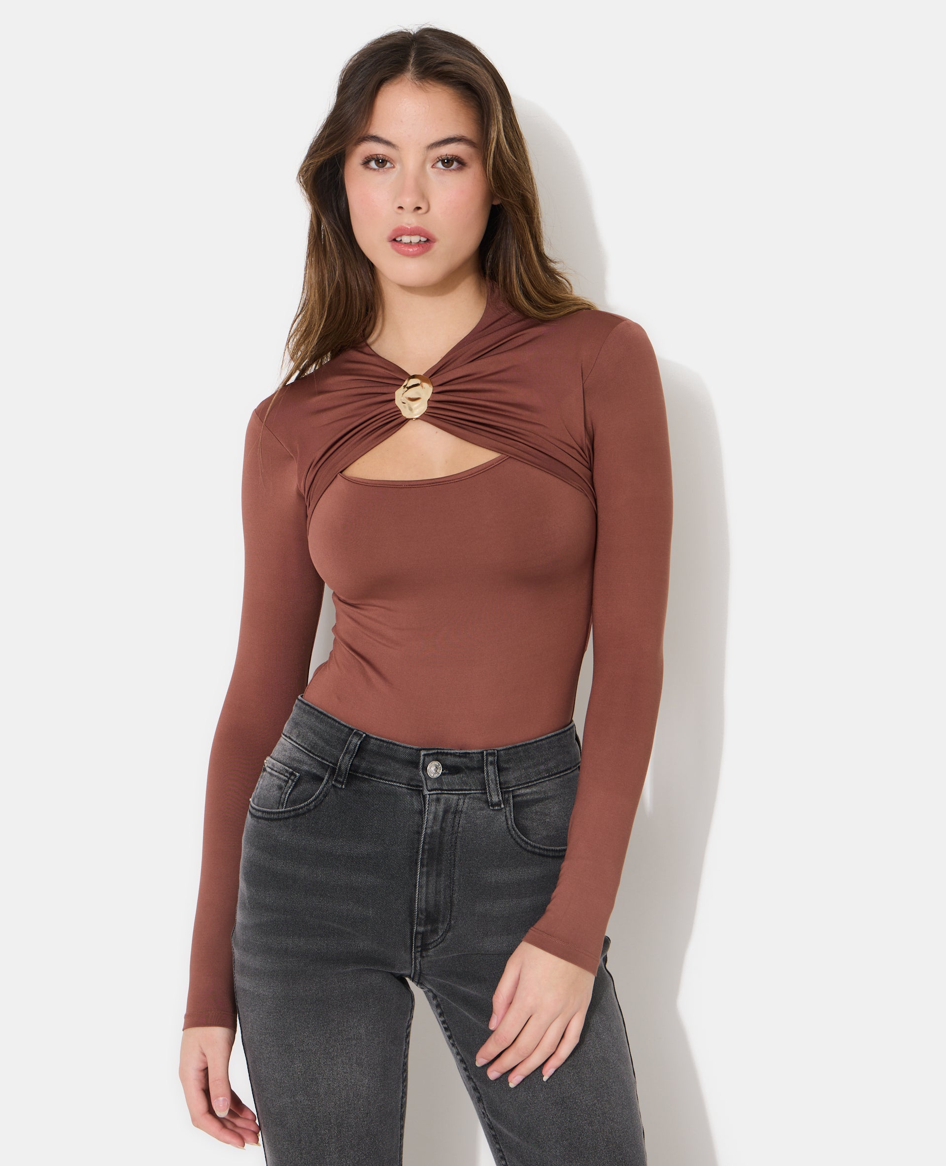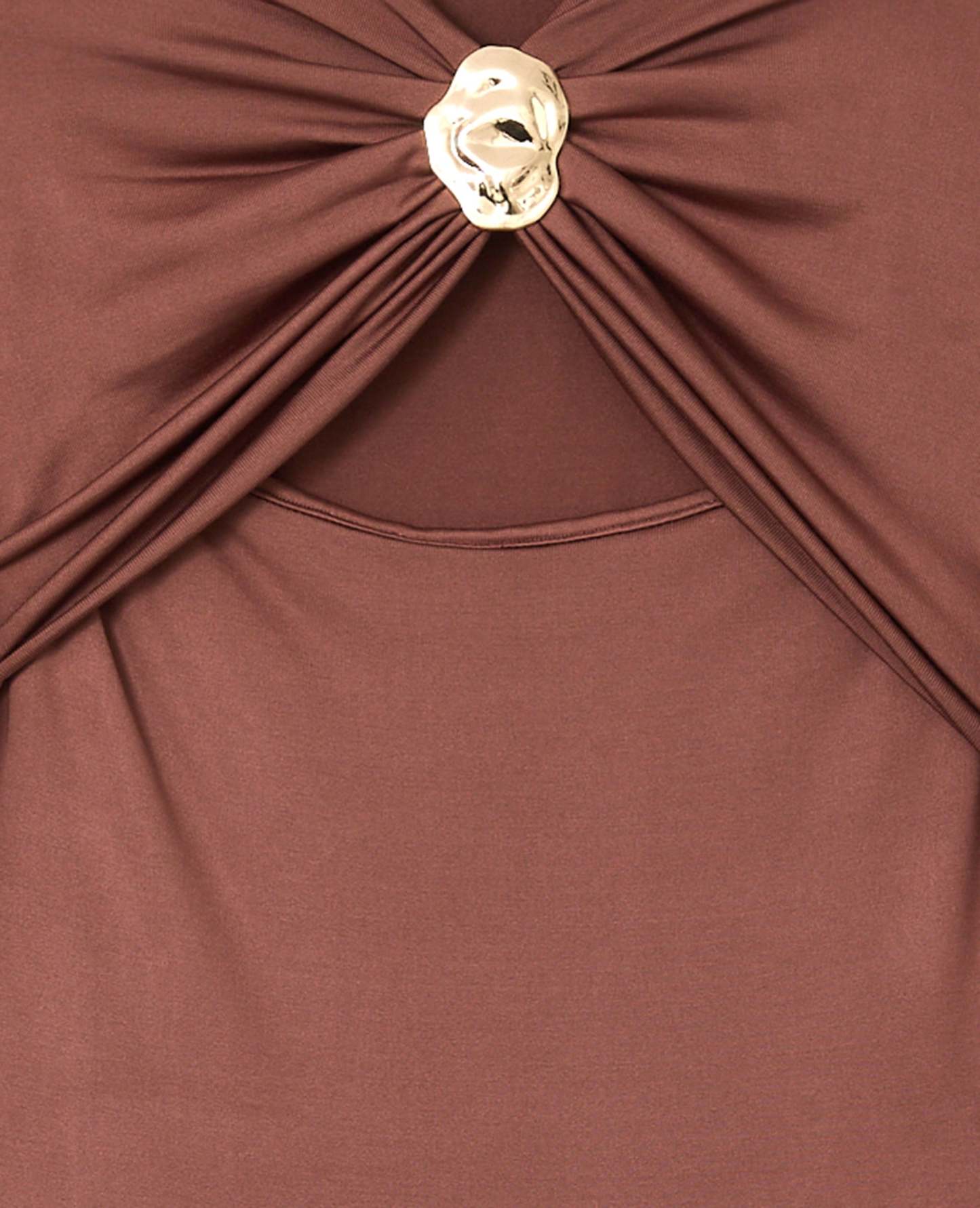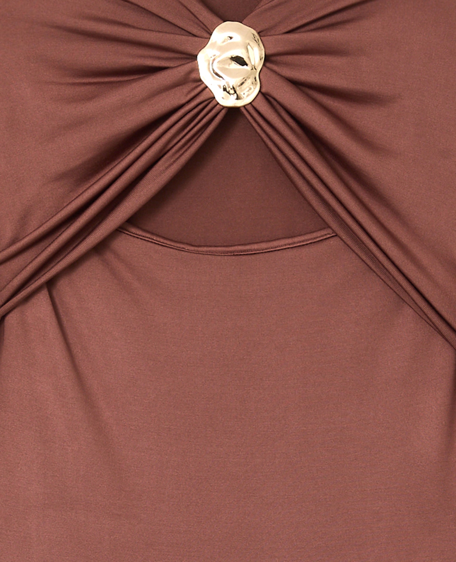 - Détail drapé à l'encolure avec boucle bijou en métal couleur or.