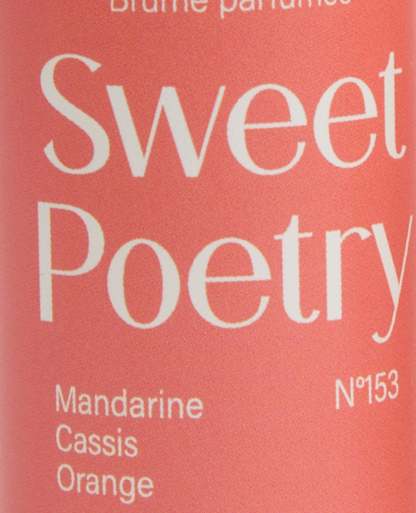 - Ingrédients Sweet Poetry : Alcohol Denat., Aqua (Water), Parfum (Fragrance), Glycerin, Linalool, Tetramethyl Acetyloctahydronaphthalenes, Limonene, Citrus Aurantium Peel Oil, Vanillin, Linalyl Acetate, Citrus Limon (Lemon) Peel Oil, Coumarin, Geraniol, Citronellol, Geranyl Acetate, Hydroxycitronellal, Pinene, Isoeugenyl Acetate, Cedrus Atlantica Oil/Extract, Lavandula Oil/Extract, Pelargonium Graveolens Flower Oil, Benzaldehyde, Rose Ketones, Pogostemon Cablin Oil, Citral