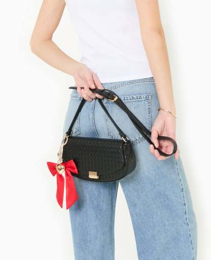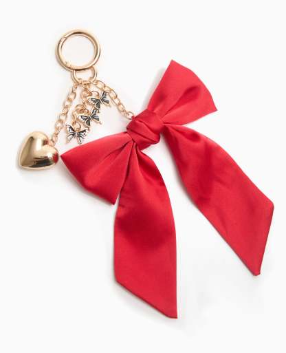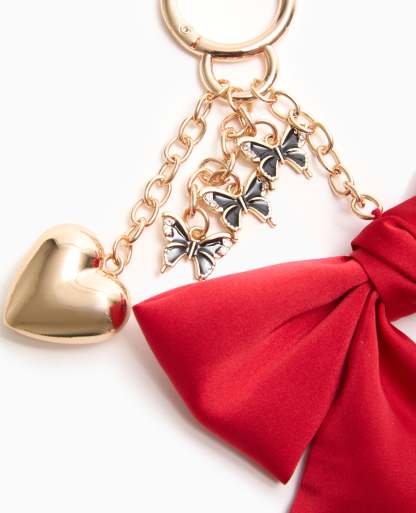 - Déco de sac avec nœud en ruban satiné rouge + cœur métallique couleur or + papillons métalliques couleur or, noir, et strass.