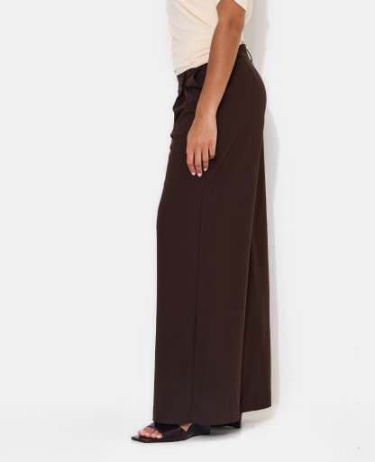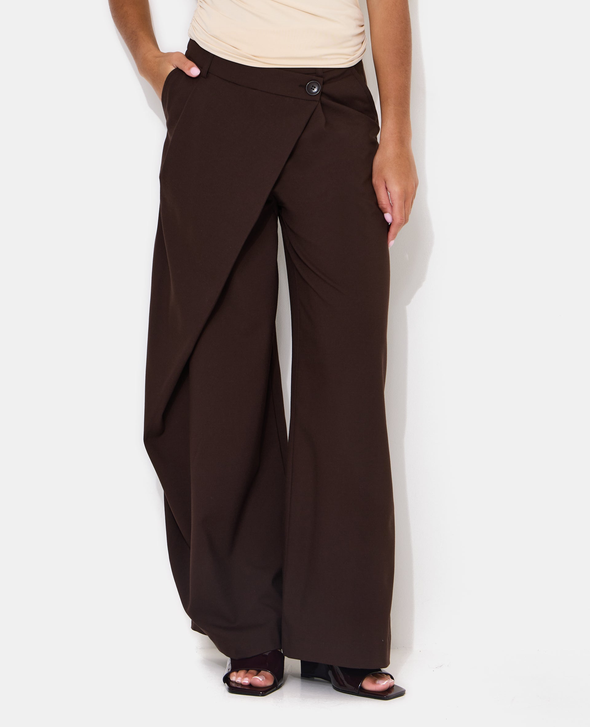 - Pantalon droit marron avec effet portefeuille devant.