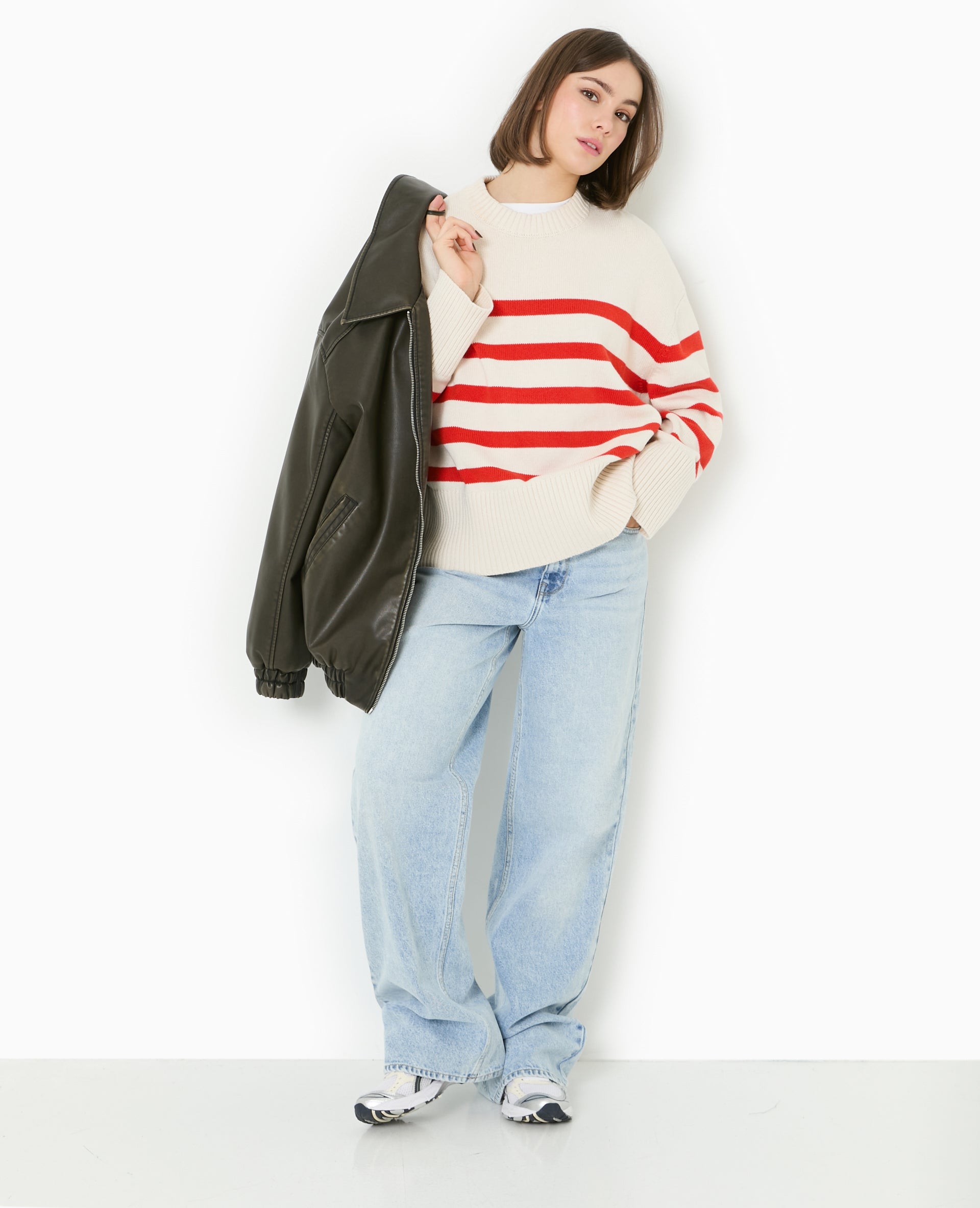 - Pull en maille écrue avec rayures rouge.