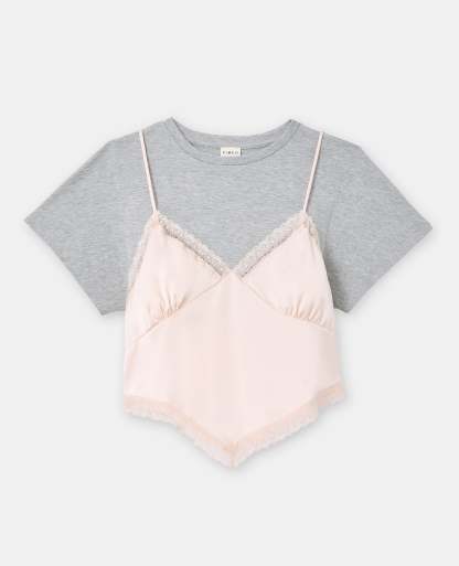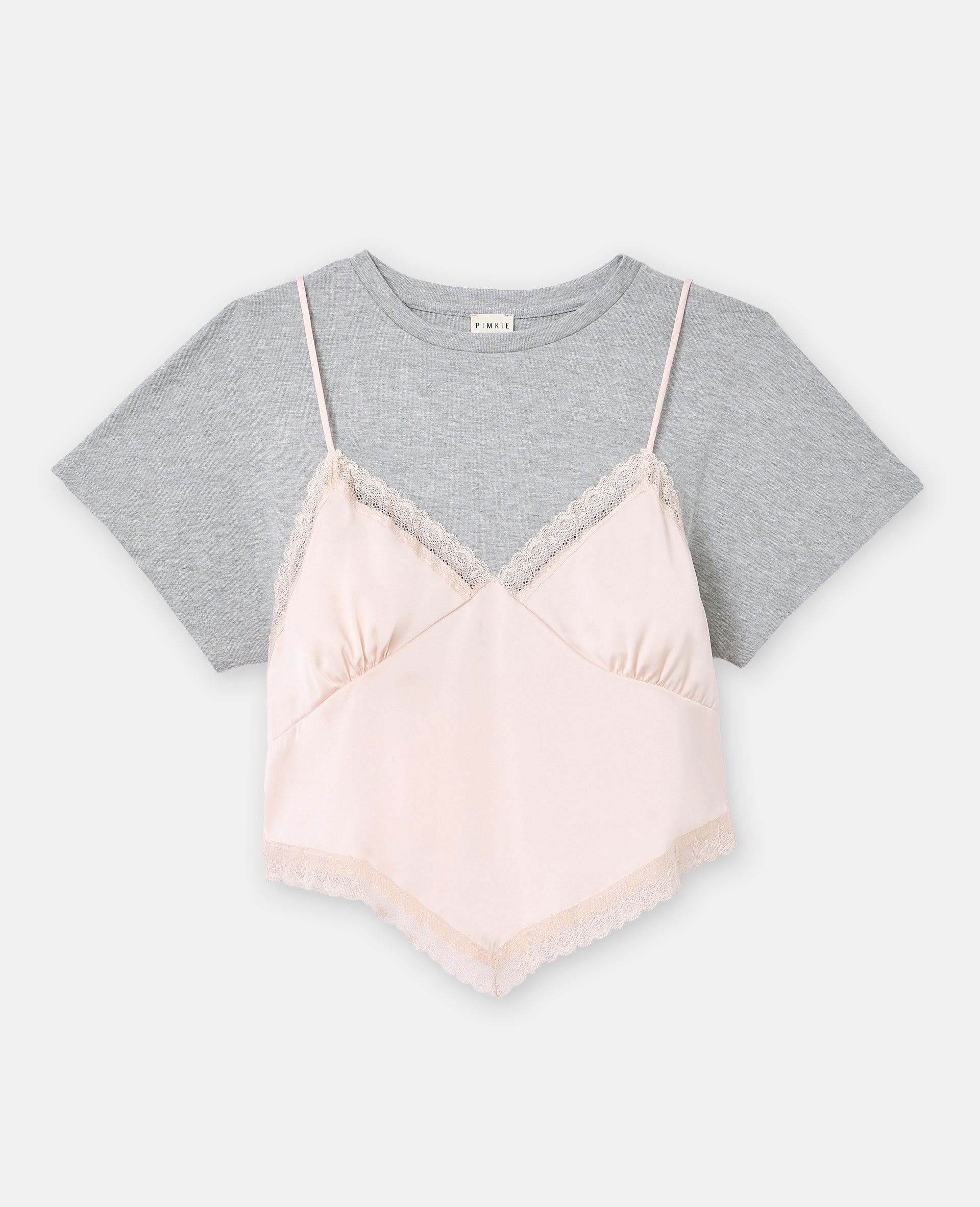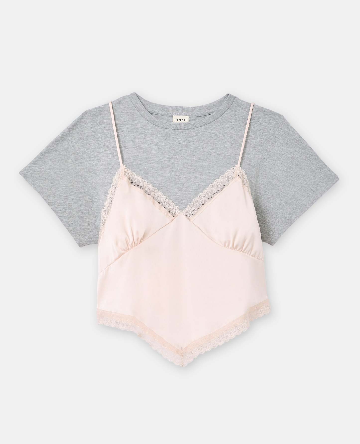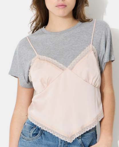 - T-shirt 2 en 1 : t-shirt gris chiné manches courtes + top rose nude façon lingerie en satin et dentelle avec finition pointe devant.
