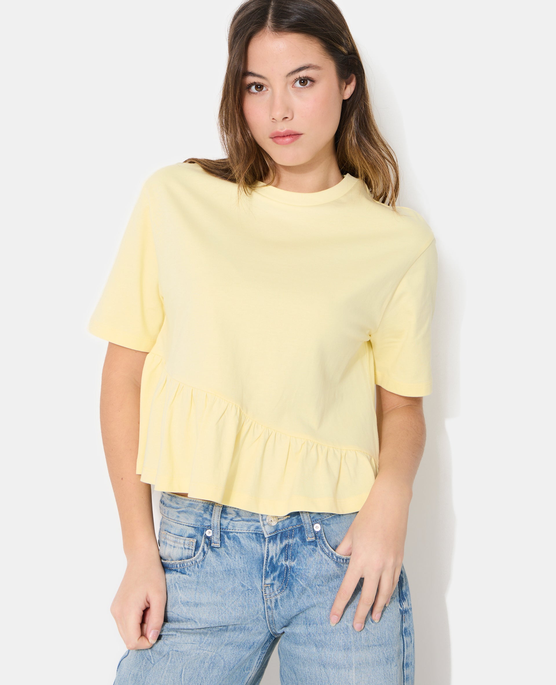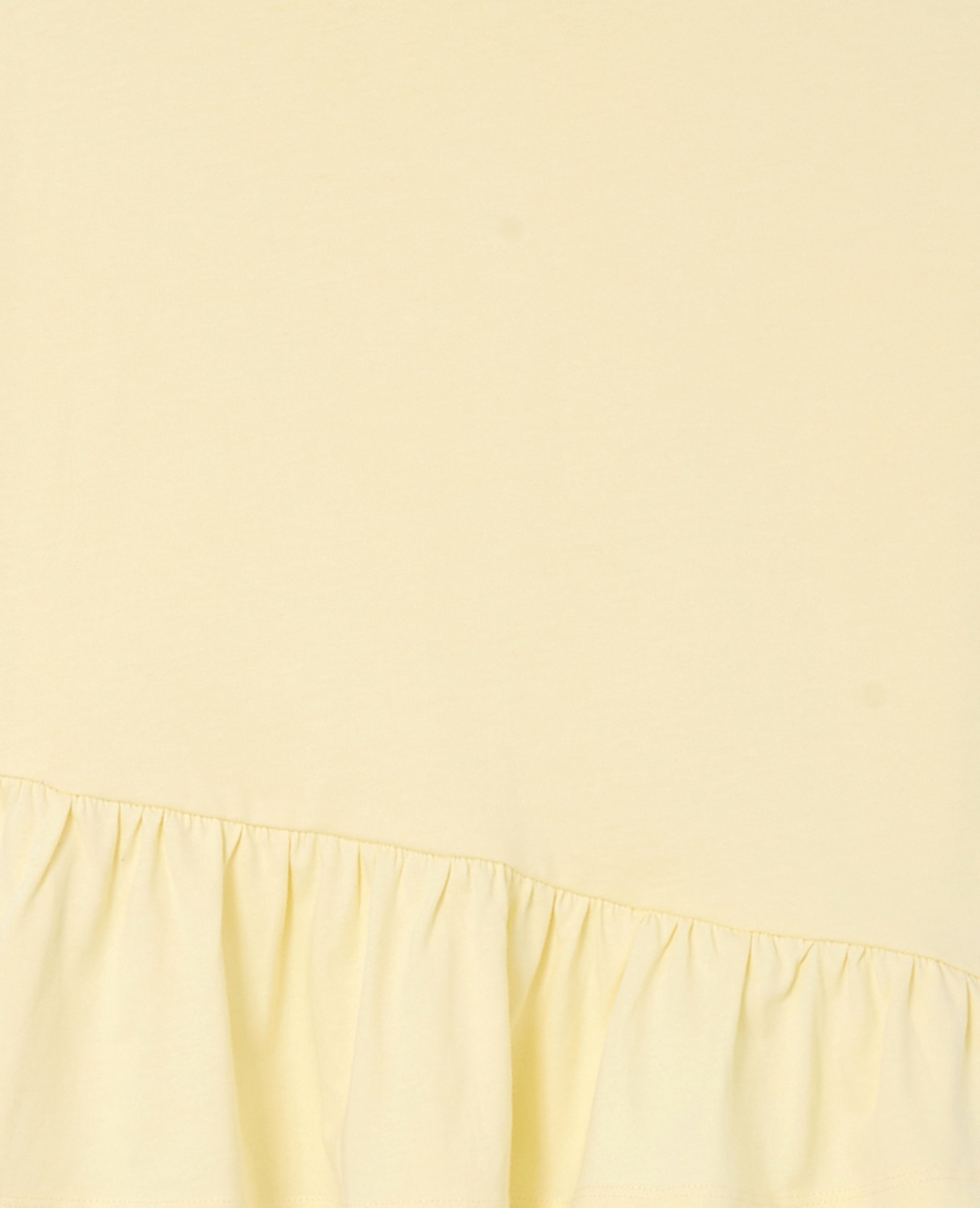 - T-shirt jaune pâle avec volant asymétrique à la base.