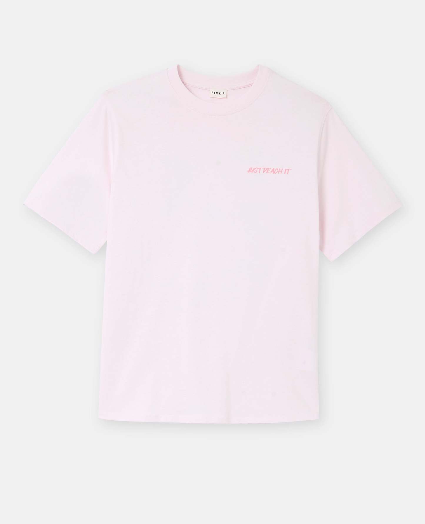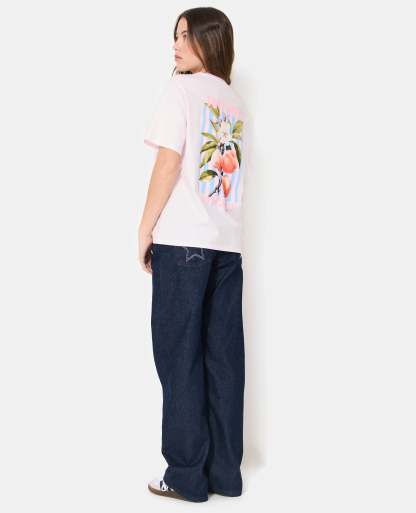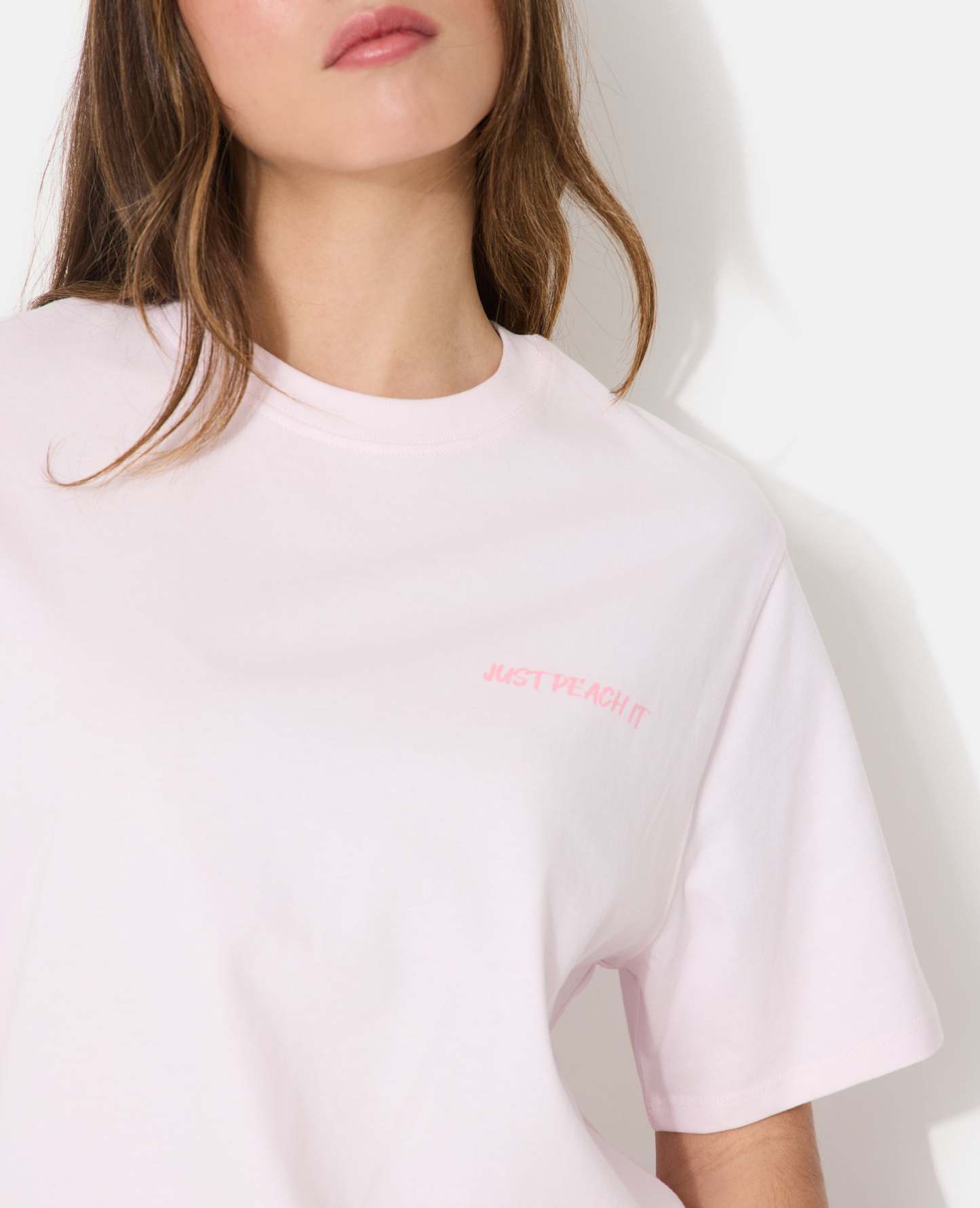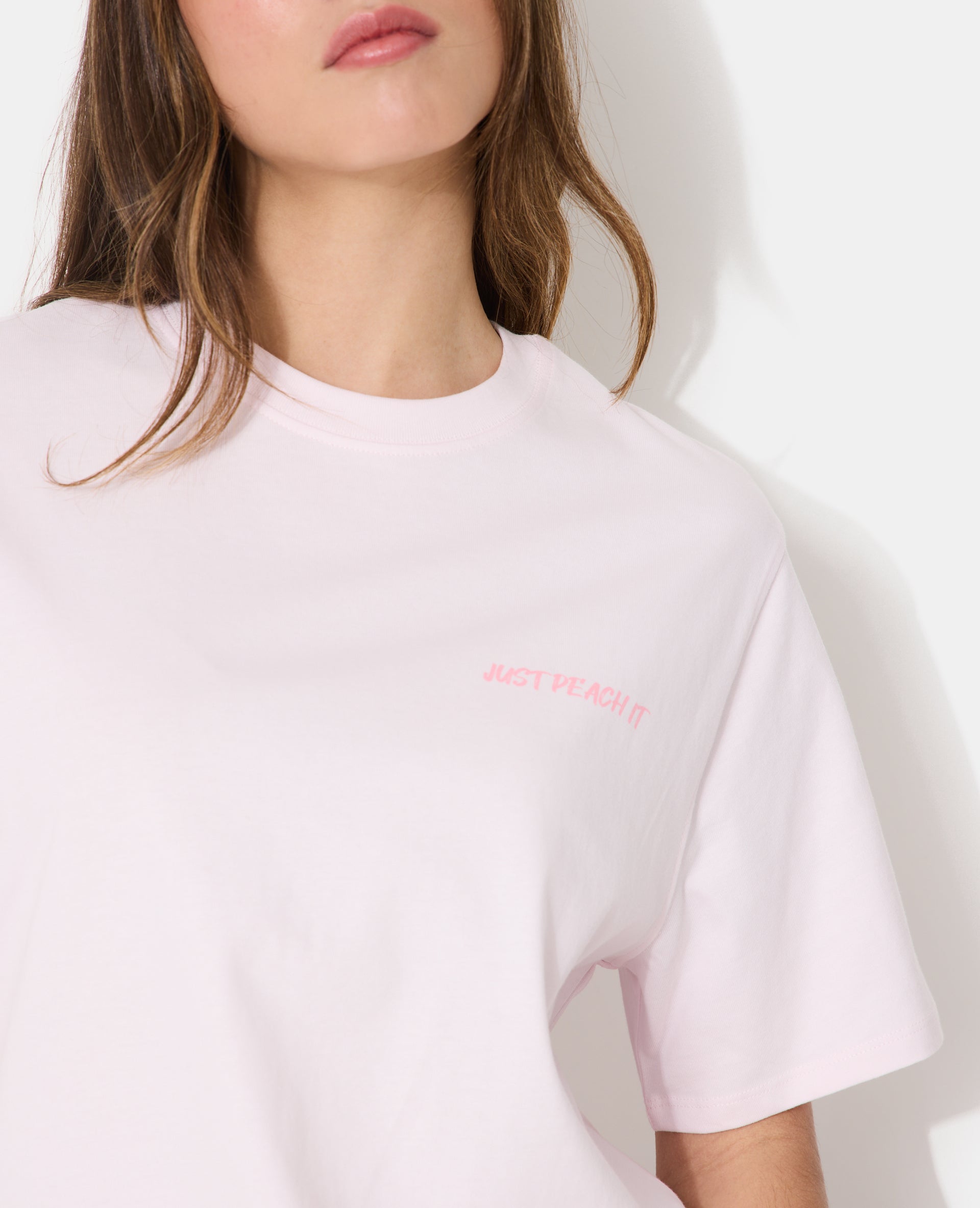 - T-shirt oversize rose pâle avec print JUST PEACH IT sur poitrine et dos.
