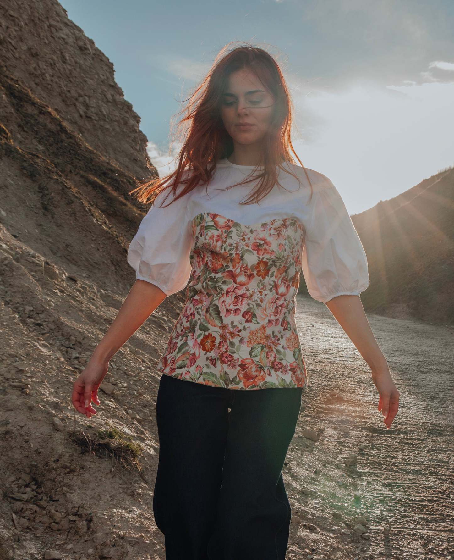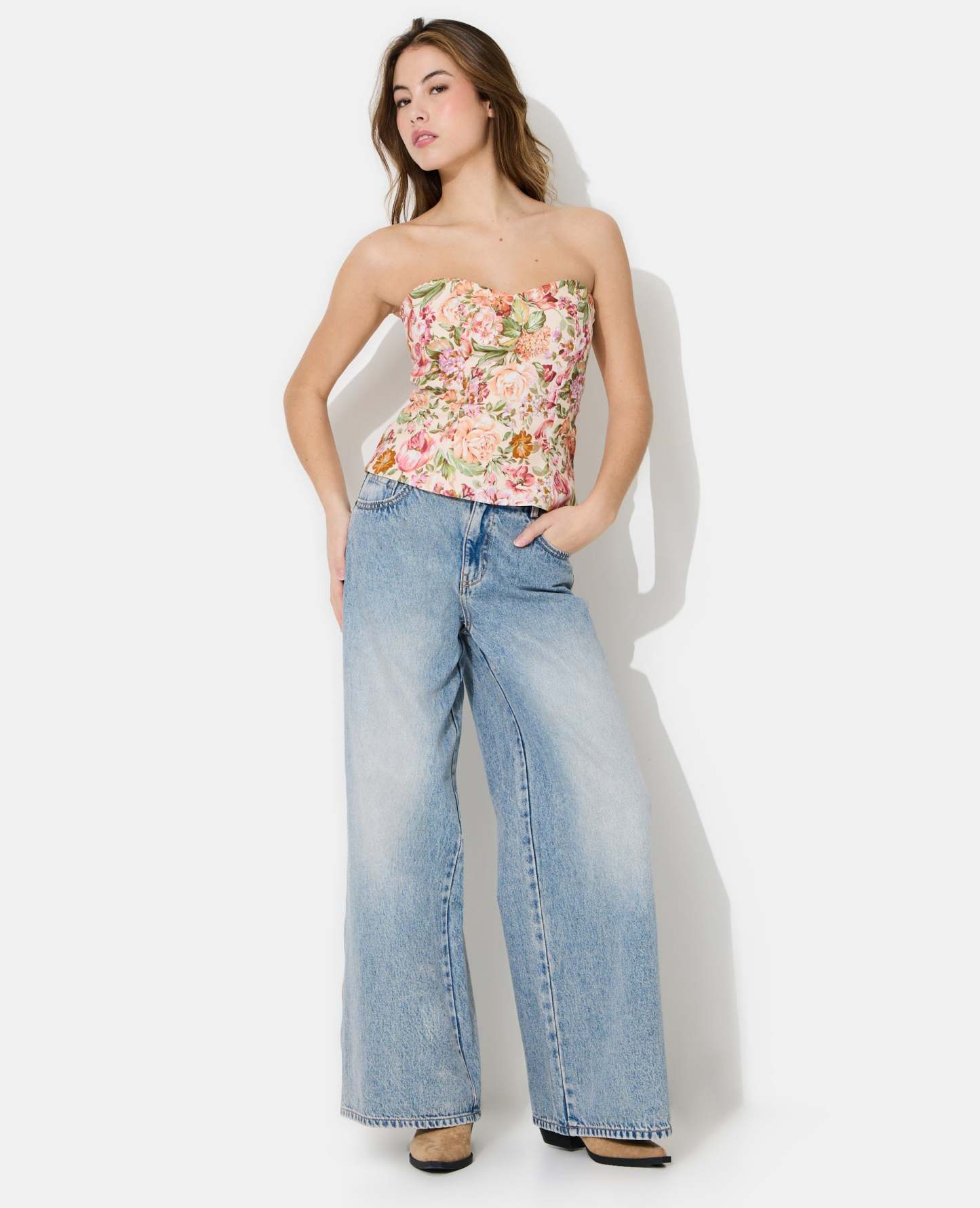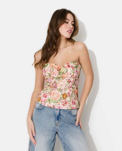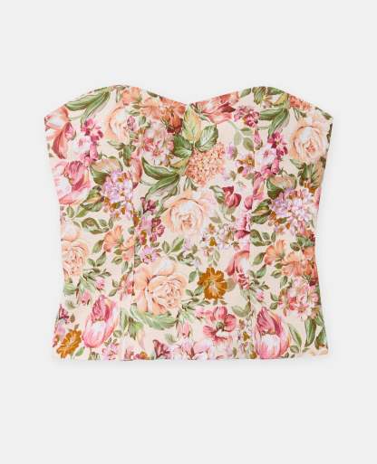 - Top bustier en tissu effet rustique motif fleurs façon tapisserie.