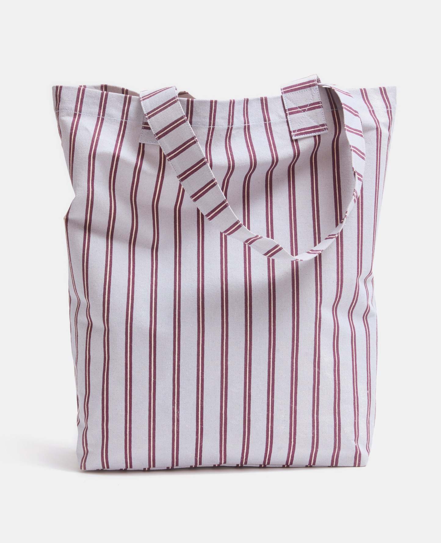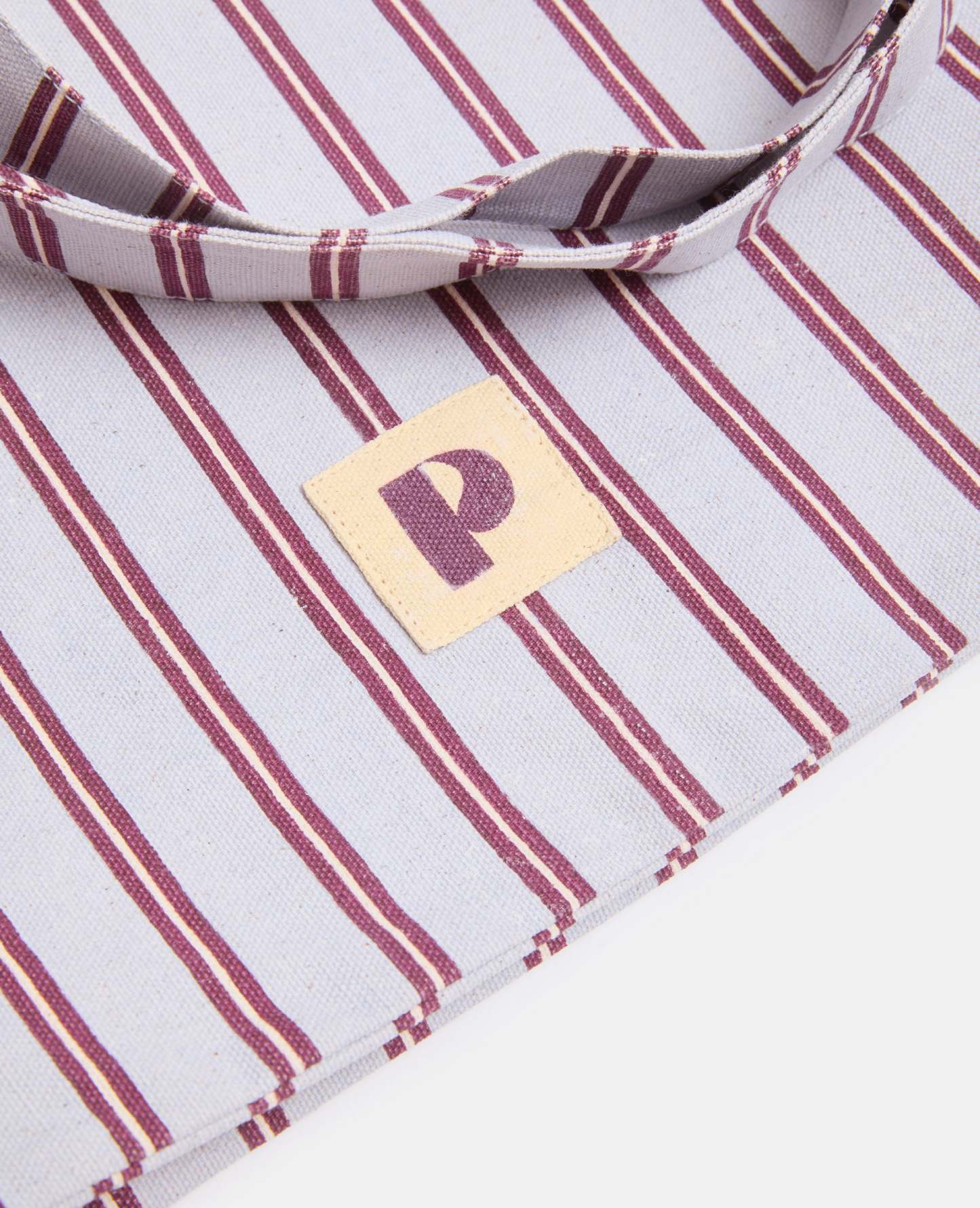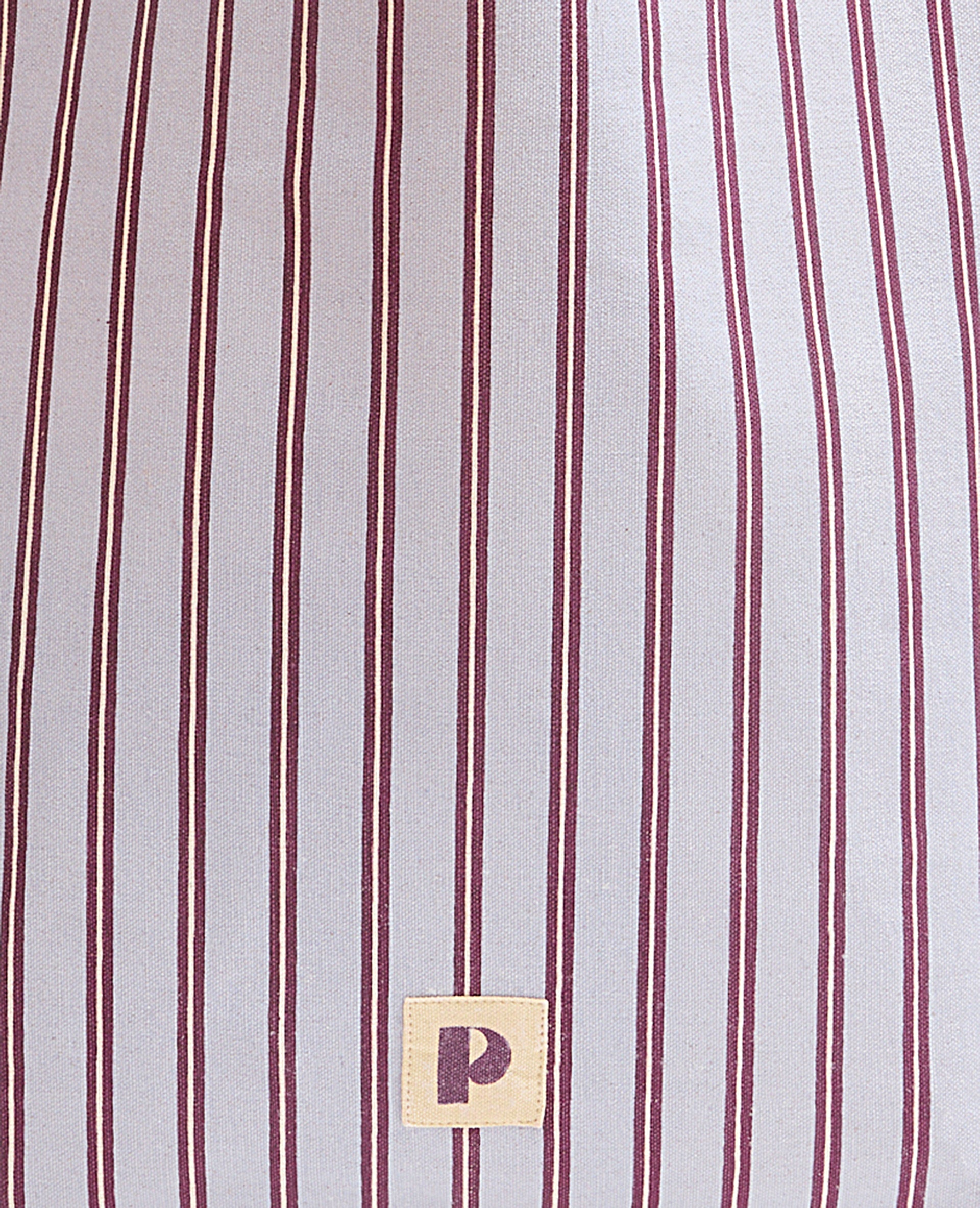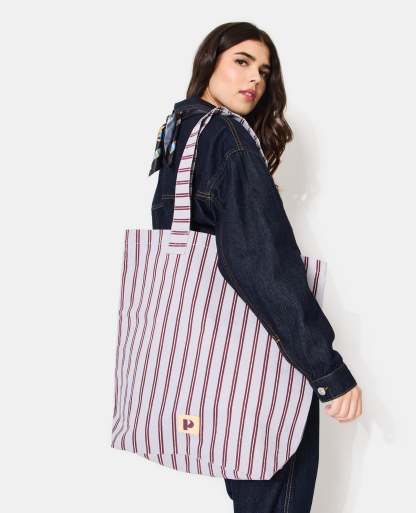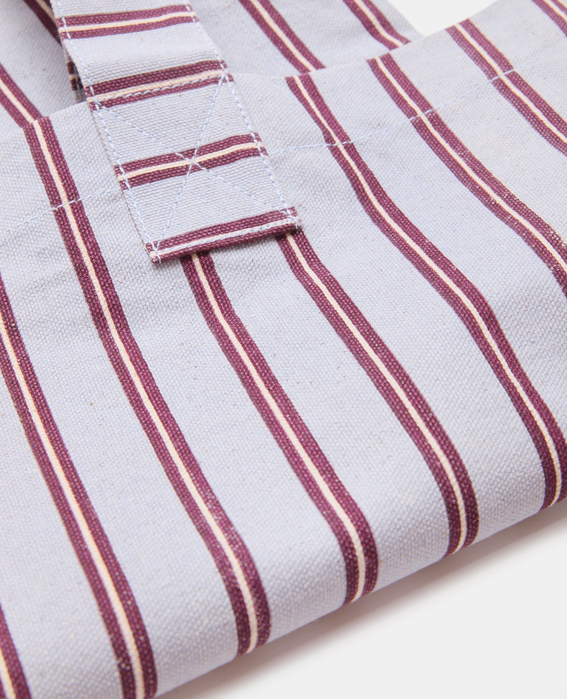 - Tote bag en toile bleu pâle avec rayures bordeaux et blanches.