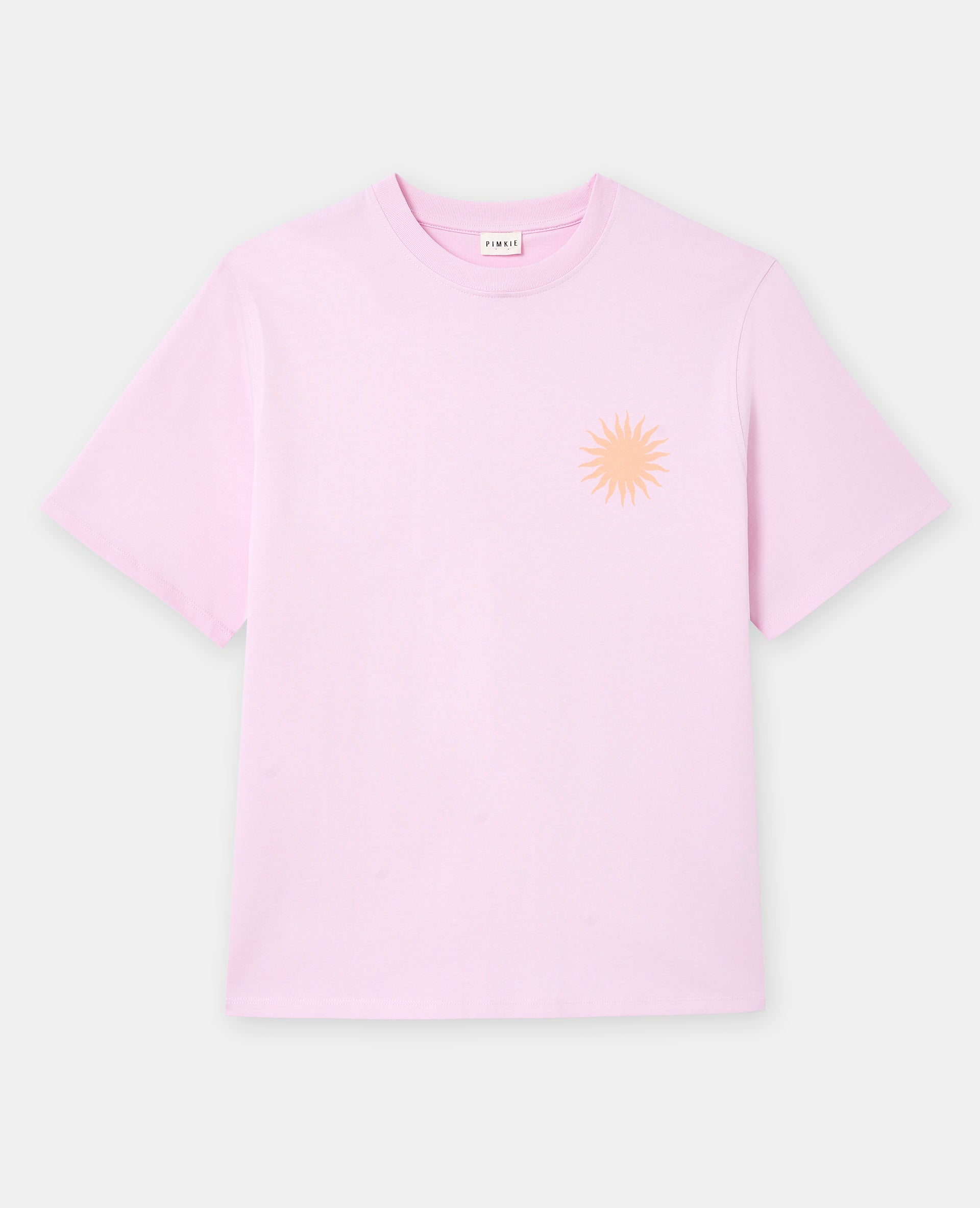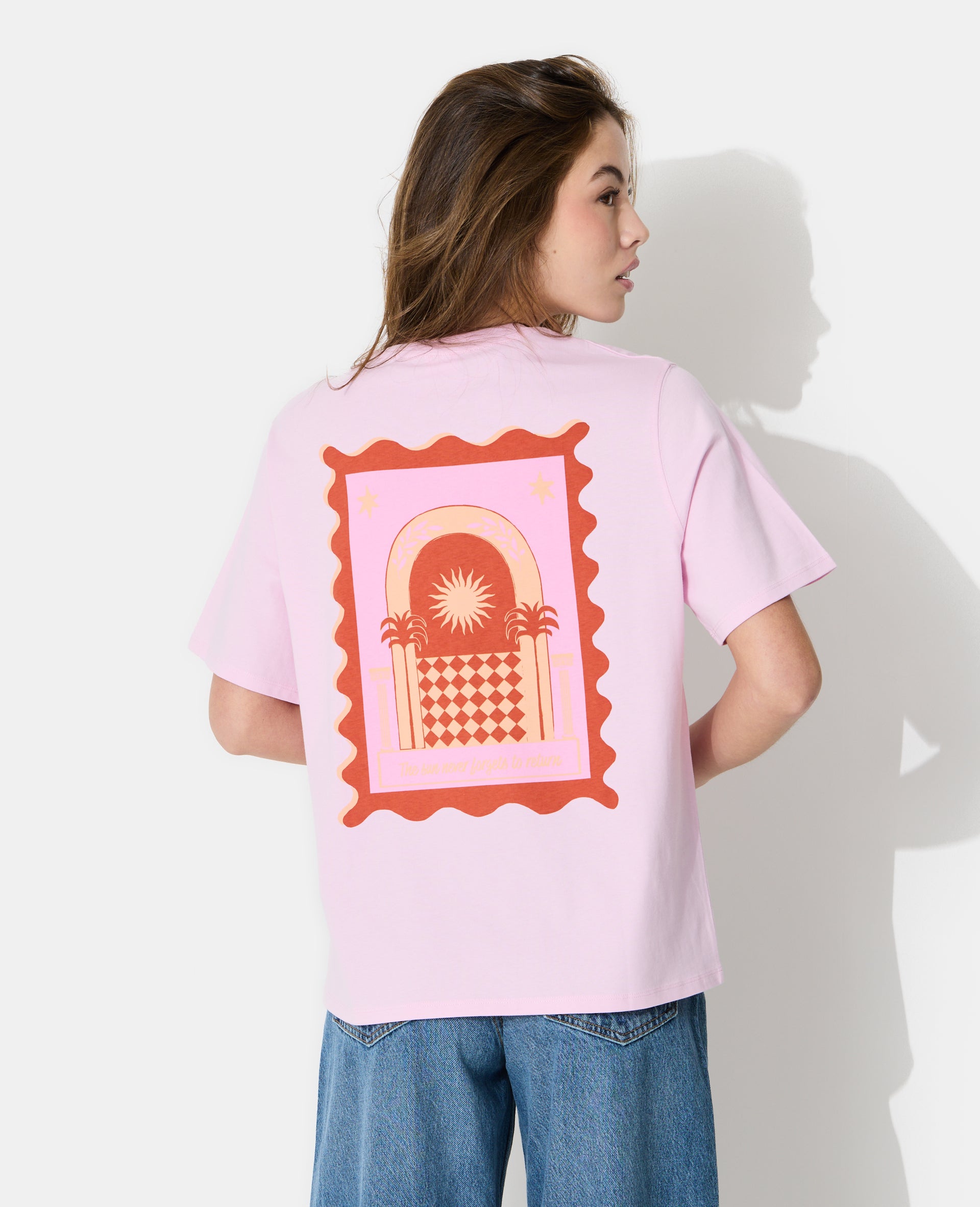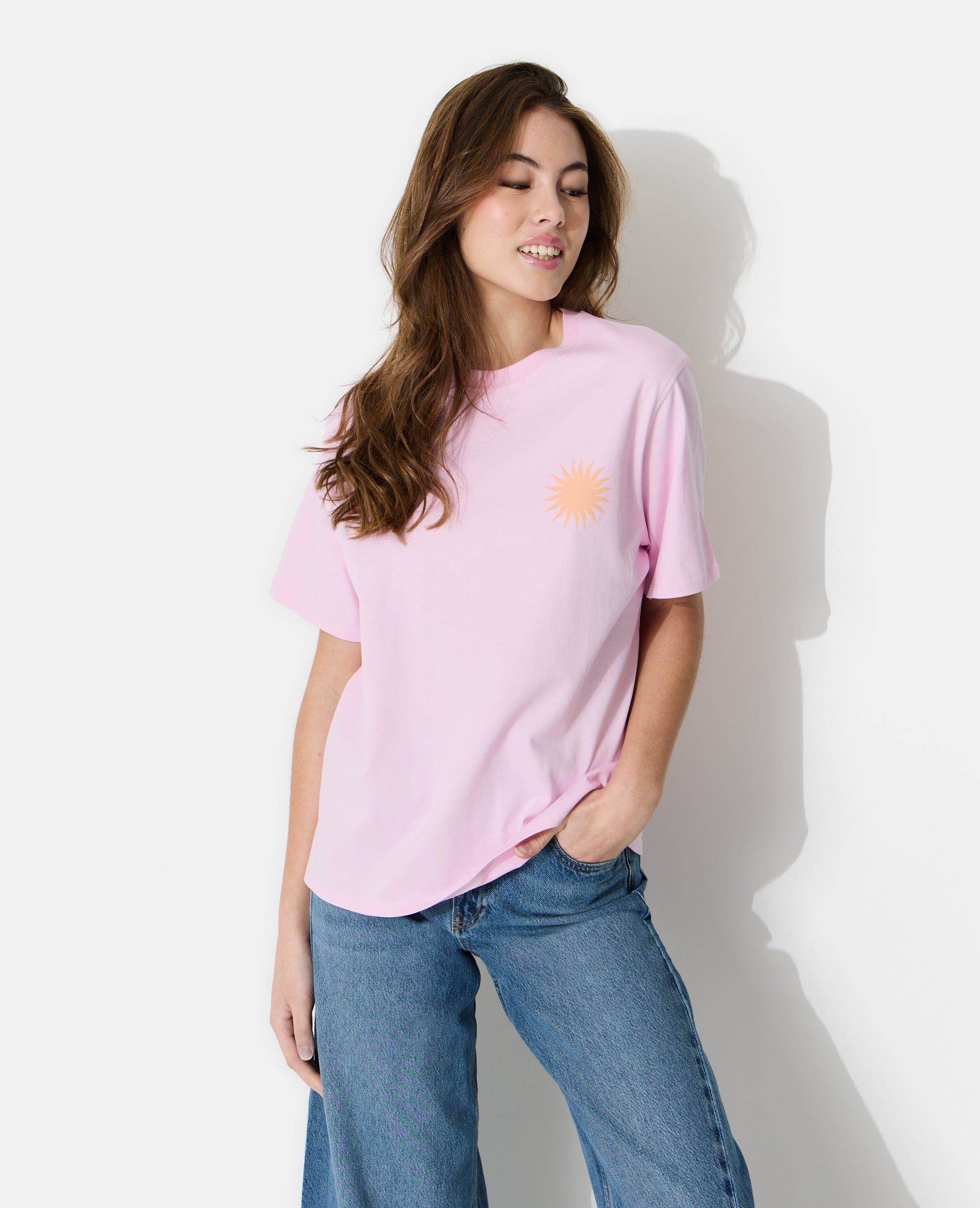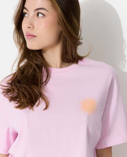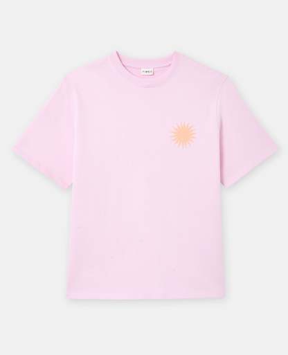 - T-shirt oversize rose pâle avec print soleil devant et dos.