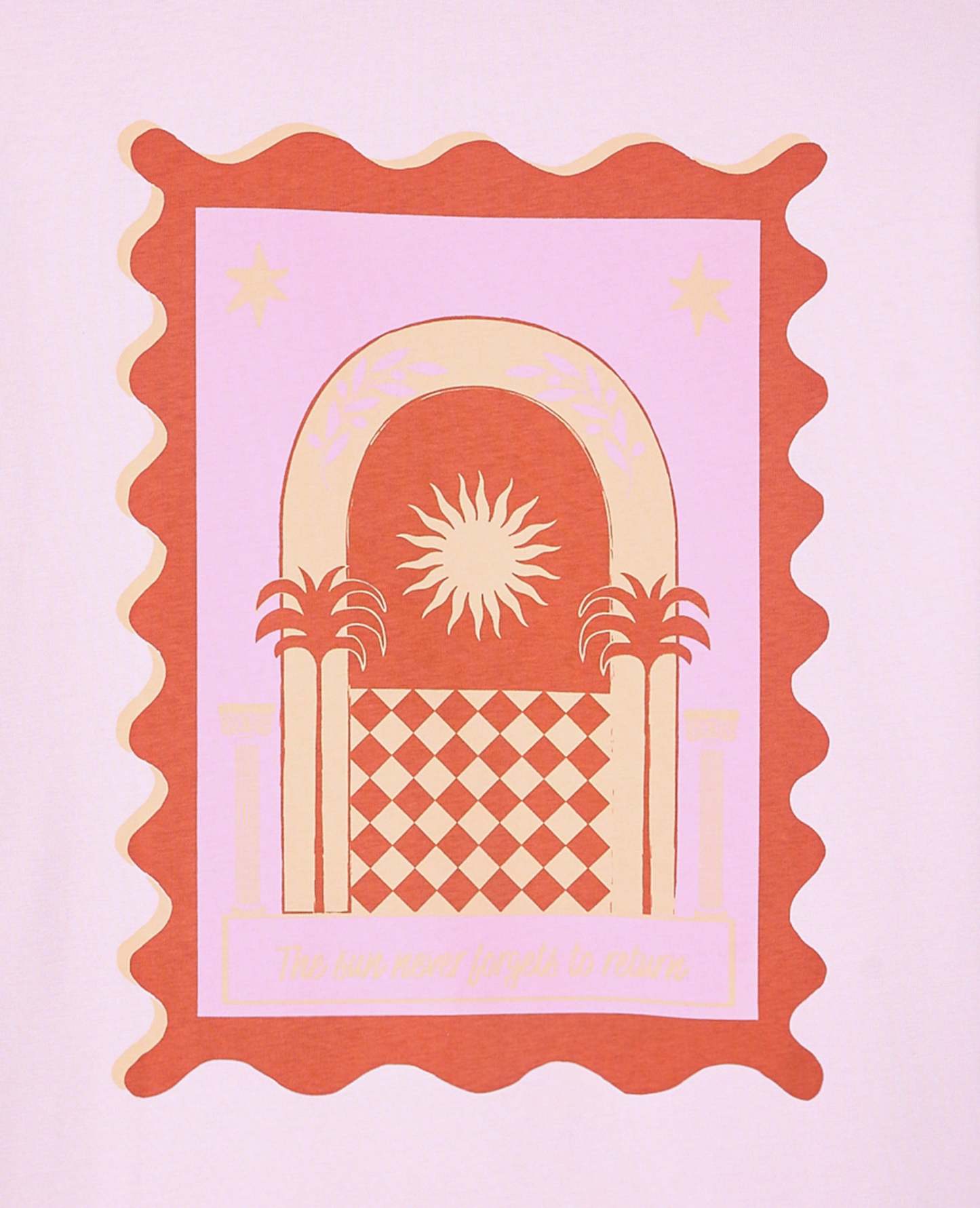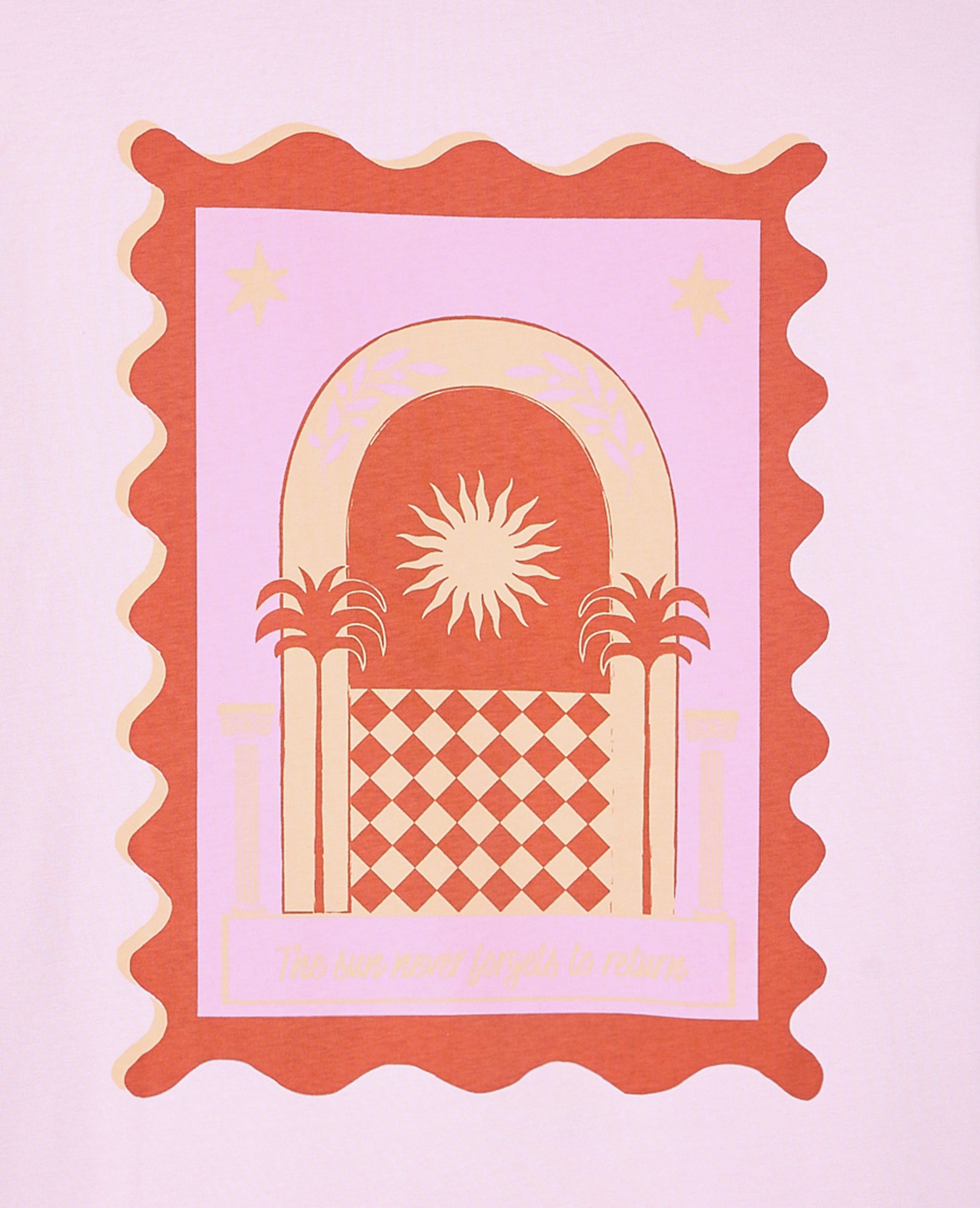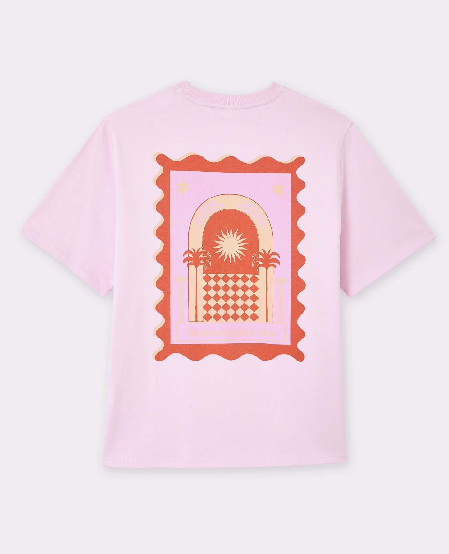 - T-shirt oversize rose pâle avec print soleil devant et dos.